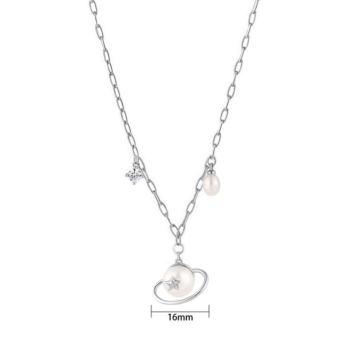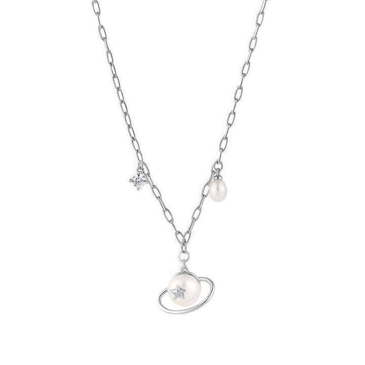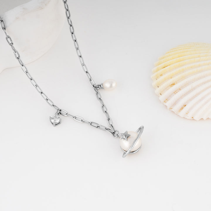 OAHLAN 925 Sterling Silver Link Chain Necklace Lustrous White Pearls Planet Design Engagement or Wedding Gift for Women